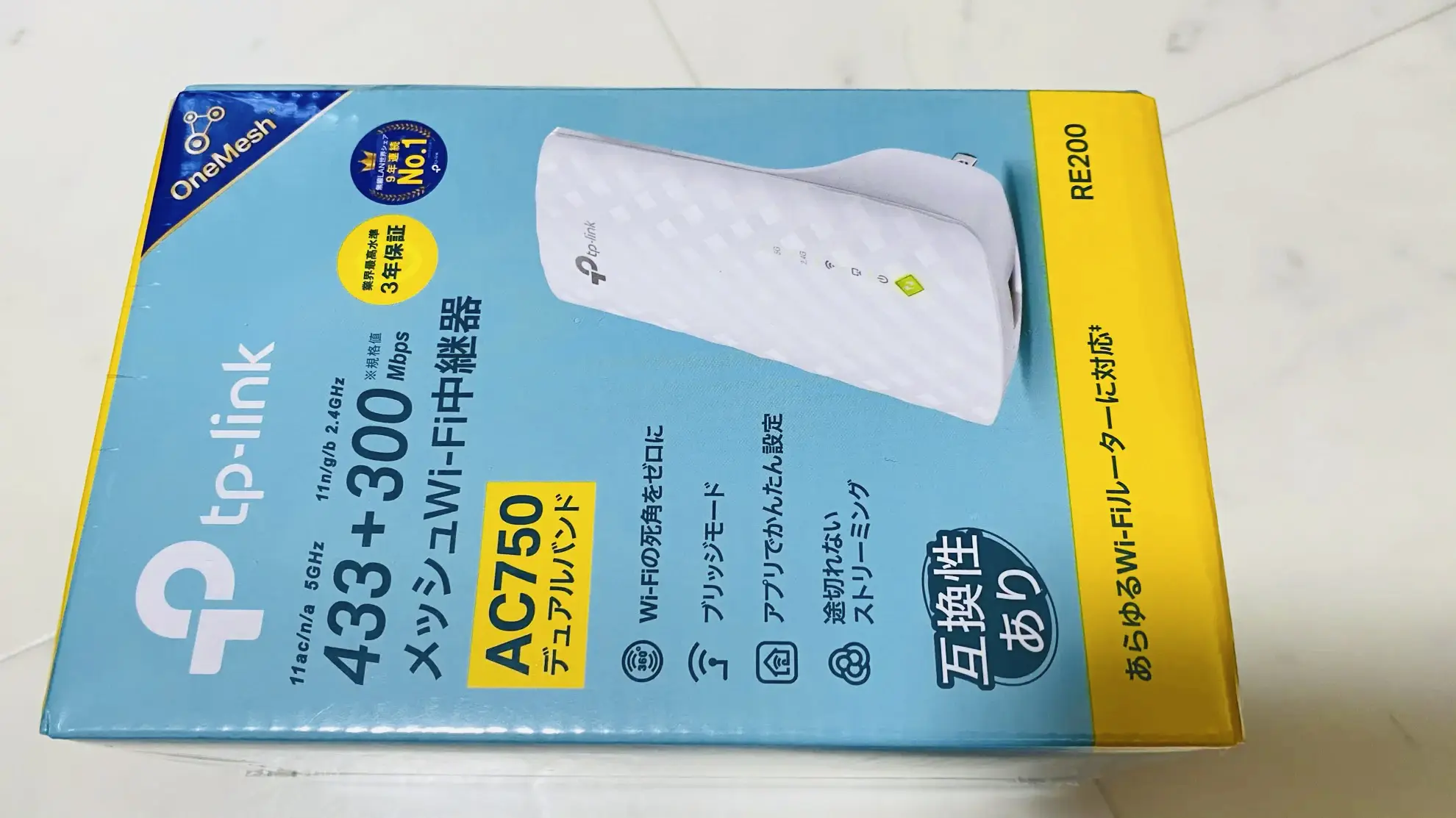 それから前述した通り、nasneは無線LAN(Wi-Fi)には非対応。しかし、私がnasneを設置したい場所は2階の自分の部屋で、1階のリビングにある親機のWi-Fiルーターからは遠くてとても有線では接続できない。そのため、Amazonで無線LAN中継機を注文して、それをイーサネットコンバータとして使いたいと思う。5GHzに対応している一番安いモデルのRE200を購入した。買った当時は値引きされていたので購入価格は1500円以下。この中継機(RE200)は有線LAN端子が搭載されていて、この中継機を親機のWi-Fiルータと接続し、中継機に搭載されている有線LAN端子とnasneを接続する事で遠くの親機のWi-Fiルータと無線で接続することができる。