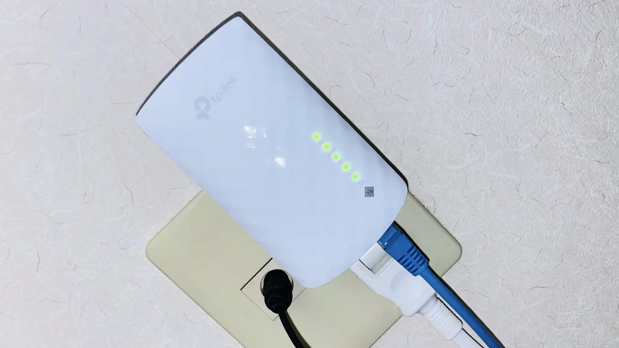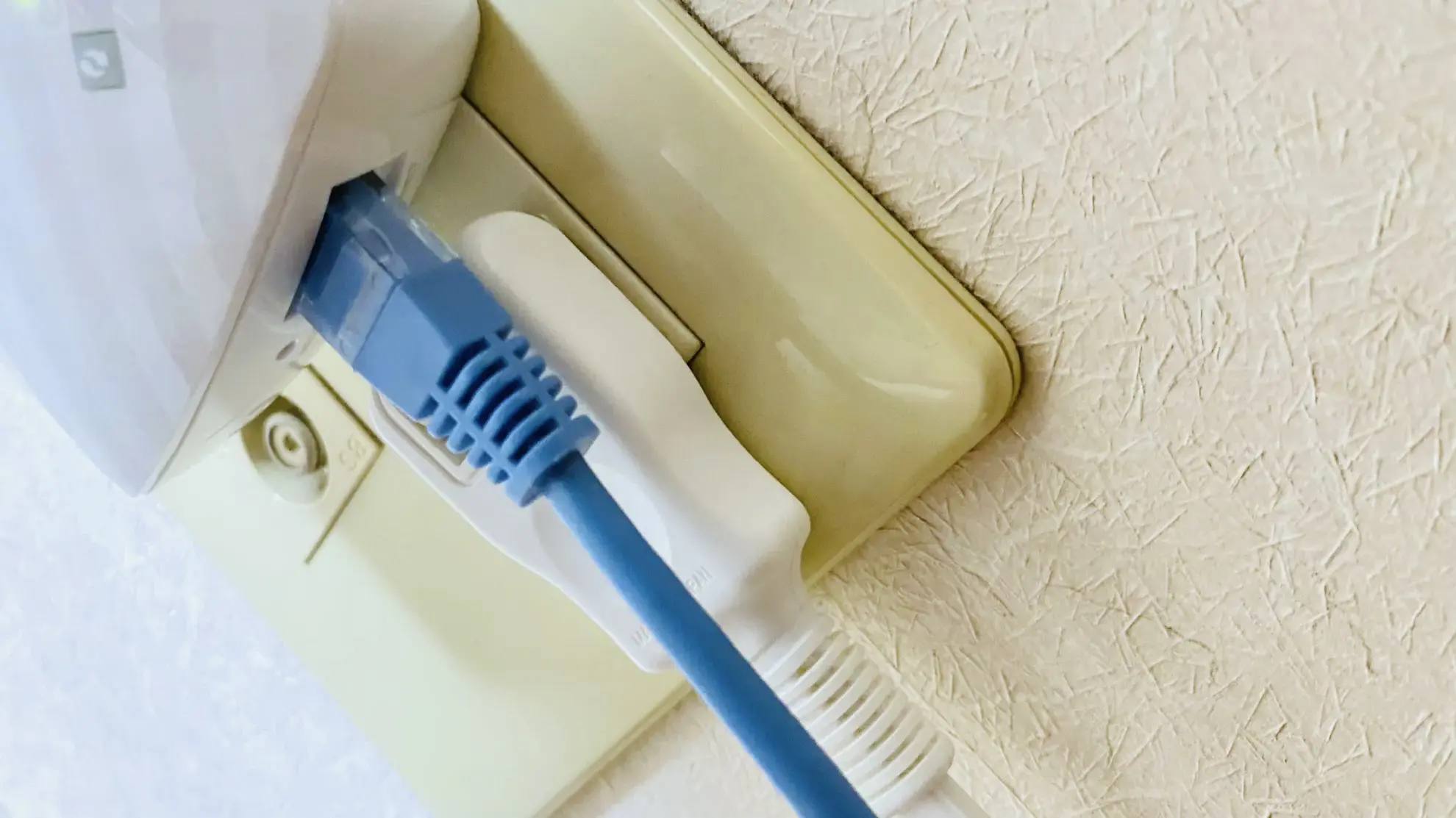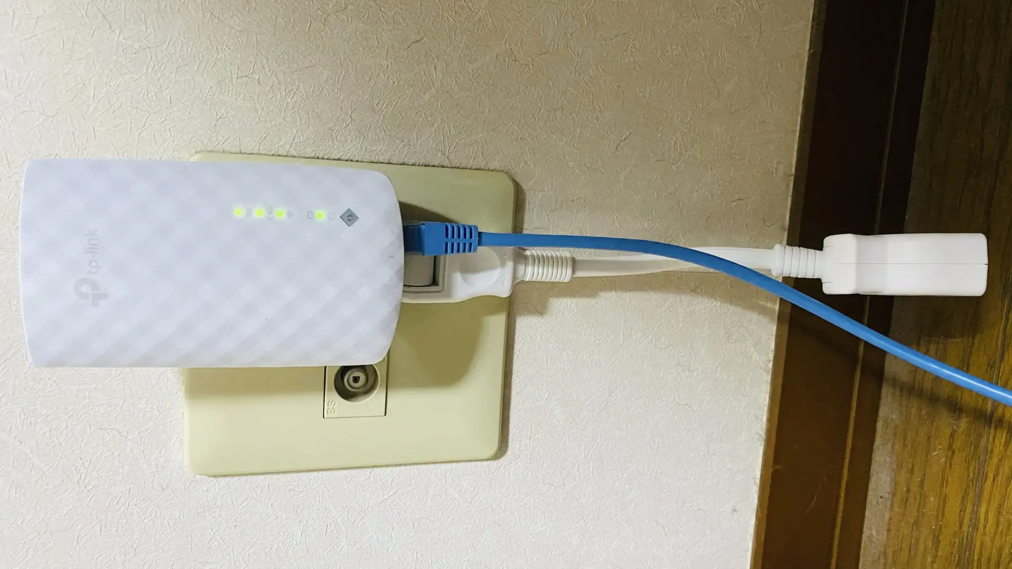 この延長コードはL字型プラグなので画像のようにLANケーブルが干渉することなく接続できる。ちなみに、この中継機の速度は有線LANで99Mbps出ていた。この機種の有線LANポートの最大速度が100MbpsなのでほぼMAX速度だ。拡張Wi-Fiとしても、中継機がある部屋で2.4GHzが80Mbps近く、5GHzが150Mbps近く出ていた。拡張Wi-Fiとしての発信強度は弱め。5GHzも直接親機ルーターと接続した方が速いが、今回の使用目的はイーサネットコンバータとしての有線LANだけなので、仕様上MAXの100Mbps近く出ているので文句なし。この性能で1500円切ってるのは素晴らしい。nasneで90Mbps台なら十分過ぎる速度だ。