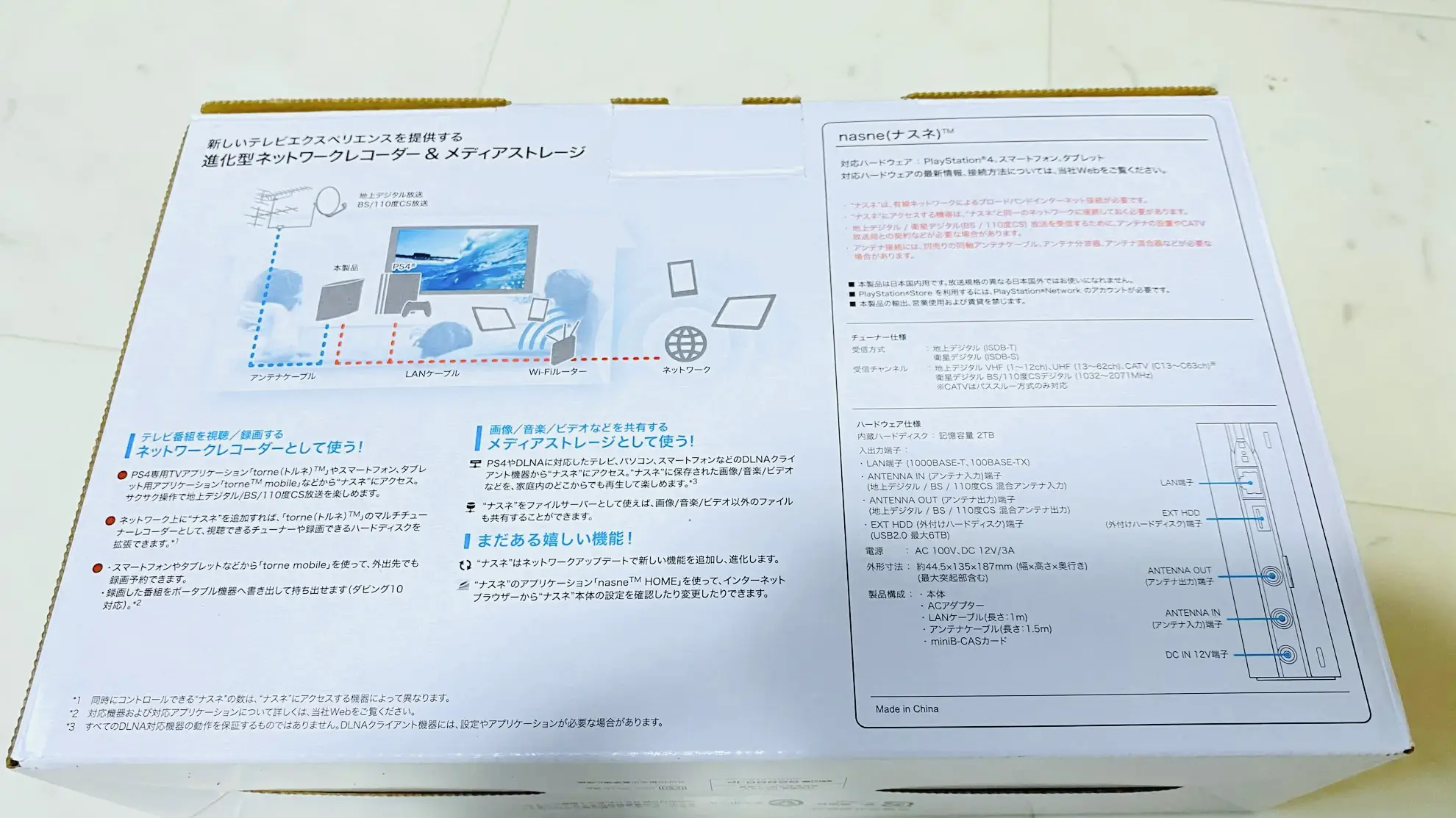 箱の裏にはいろいろな説明が載っていた。nasneはネットワークレコーダー&メディアストレージだそう。