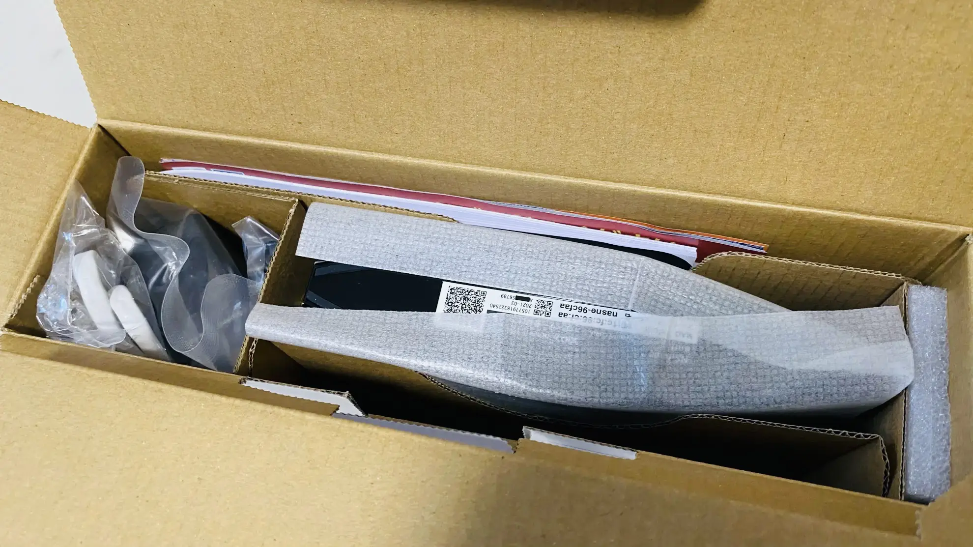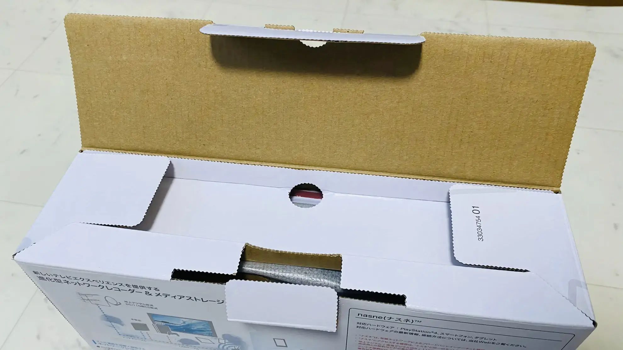 そして見えてきました。結構隙間なく、付属品など詰まっている。nasne本体はひっくり返しの向きで入っていた。ちなみに、Macでこのnasneのストレージに接続してNASとして使いたい時は、Finderを開き、Command+Kを押して、[smb://ファイルサーバー名]と入力するとnasneに接続できまる。この画像にあるようにnasneの底面のシールに記載されているnasne-×××××××がファイルサーバー名。著作権の関係からFinderで録画データを見ることはできない。M1 Macならtorne mobileをインストールすれば、スマートフォンのようにnasneでテレビをみたり、録画したりすることも可能。