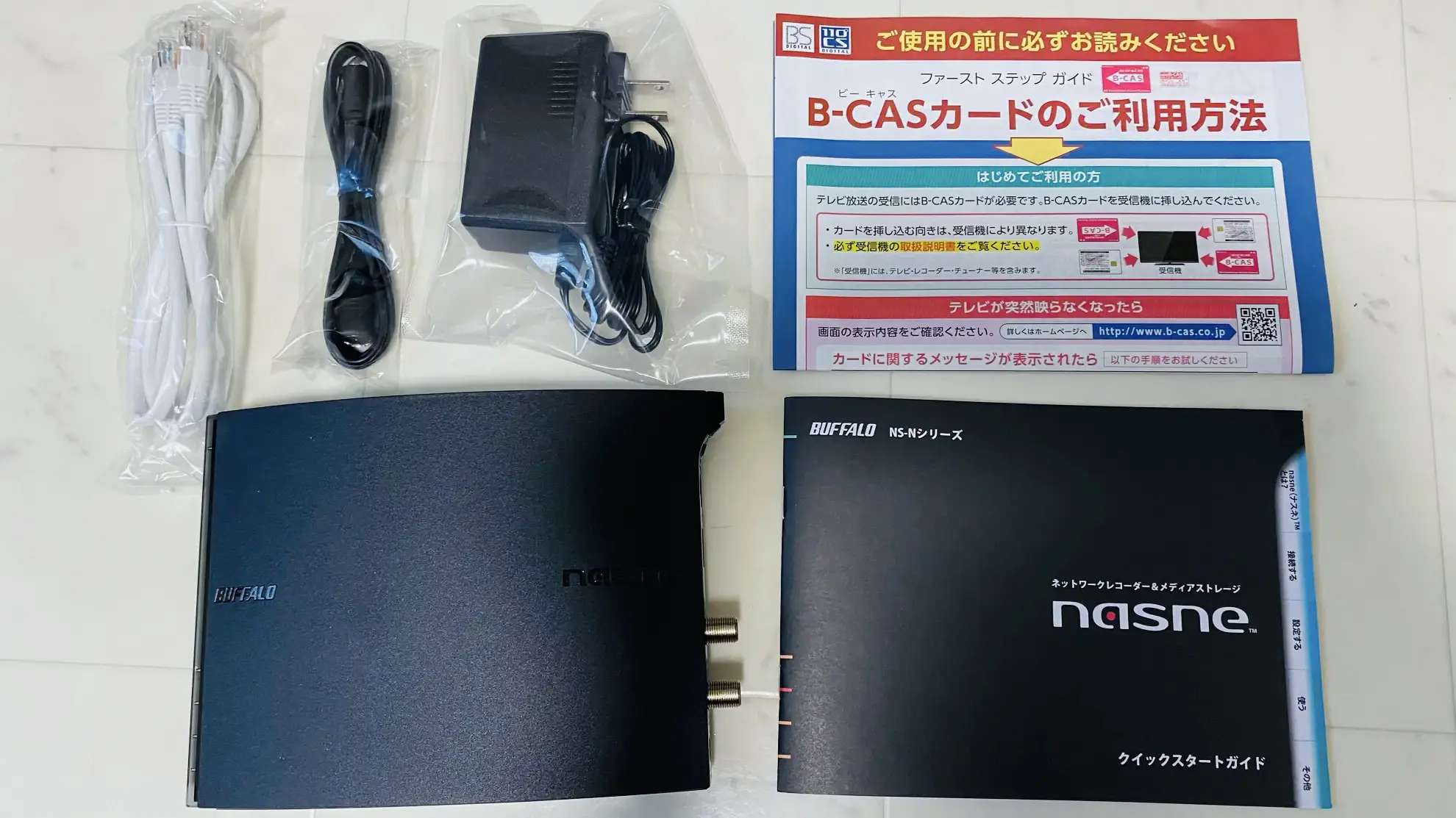 箱から取り出した同梱品一式。付属品は左からLANケーブル、アンテナケーブル、ACアダプター、mini B-CASカードで左下が本体で右下が取扱説明書。SIE製nasneは通常のB-CASカードを採用していたが、Buffalo製nasneではmini B-CASカードに変更になっている。これは静音ファンを搭載するためにmini B-CASカードを採用したのだと思われる。