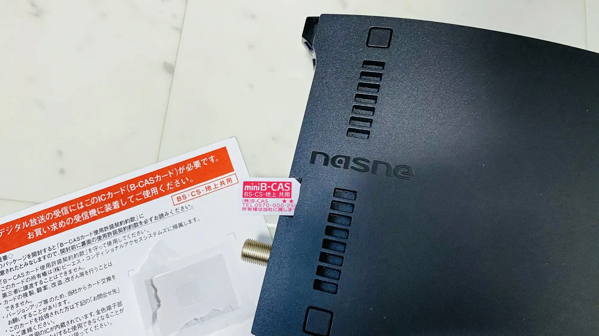付属品を確認したところでセットアップに移る。まず、mini B-CASカードを台紙から剥がして、SDカードを入れるようにカチッとしっかり奥までB-CASカードスロットに挿入する。SIE製nasneとデザインは一緒だが、Buffalo製nasneはファンが搭載されているため、画像のように空気穴がある。
