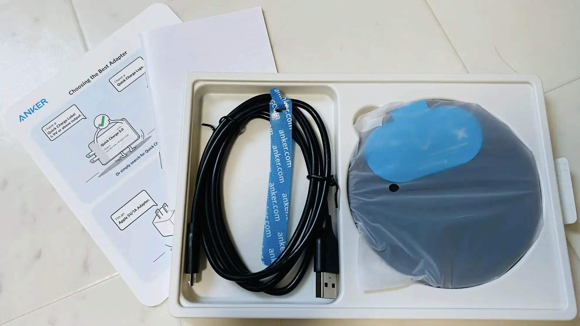 開封すると本体とmicro-USB(micro B端子)ケーブルが付属している。一番安いワイヤレス充電器なので旧規格の充電端子が採用されていた。ケーブルは1.5mで、ケーブルをまとめられるマジックテープも付属されていて、安い割にはしっかりとしている。