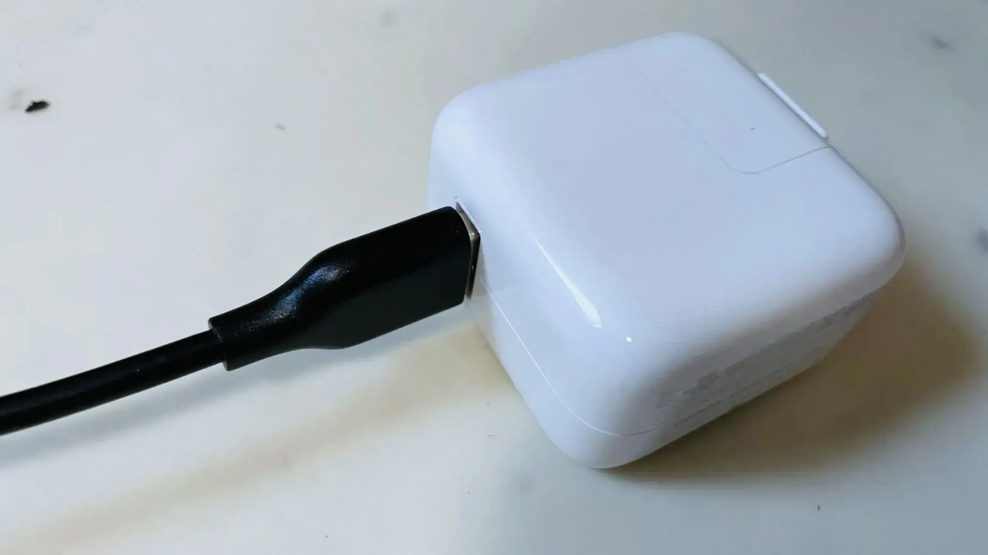 このワイヤレス充電器にはケーブルは付属されているが、肝心の電源アダプタが付属していないので別途用意する必要がある。対応する電源アダプタは5W充電の場合は5V/2A(10W)、7.5W、10W充電の場合は9V/2A(18W Quick Charge2.0/3.0)。今回はiPad miniを購入した際に付属していた10Wの電源アダプタを使用する。付属しているケーブルはmicro-USB端子の逆側はUSB-A端子になっている。画像のように挿す。