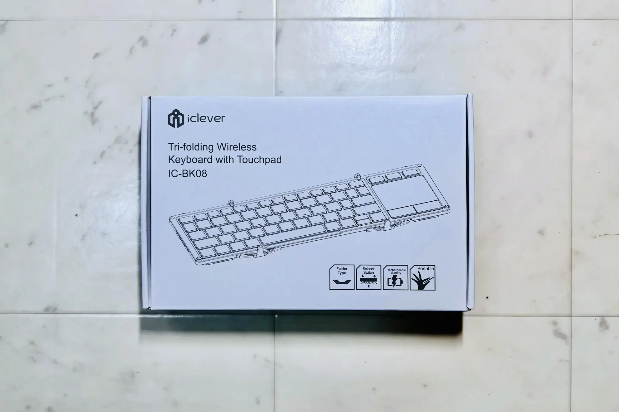 今回紹介するのはタッチパッド搭載、iCleverの折りたたみ式Blutooth キーボード、IC-BK08です。これを買った理由はiPad Proと一緒に持ち運べるコンパクトな外付けワイヤレスキーボードが欲しかったから。このIC-BK08の特徴はキーボード本体を3つ折りにして実際の大きさの2分の1の大きさで持ち運べることと、小さめではあるがトラックパッドが搭載されていることだ。それでは早速開封していく。