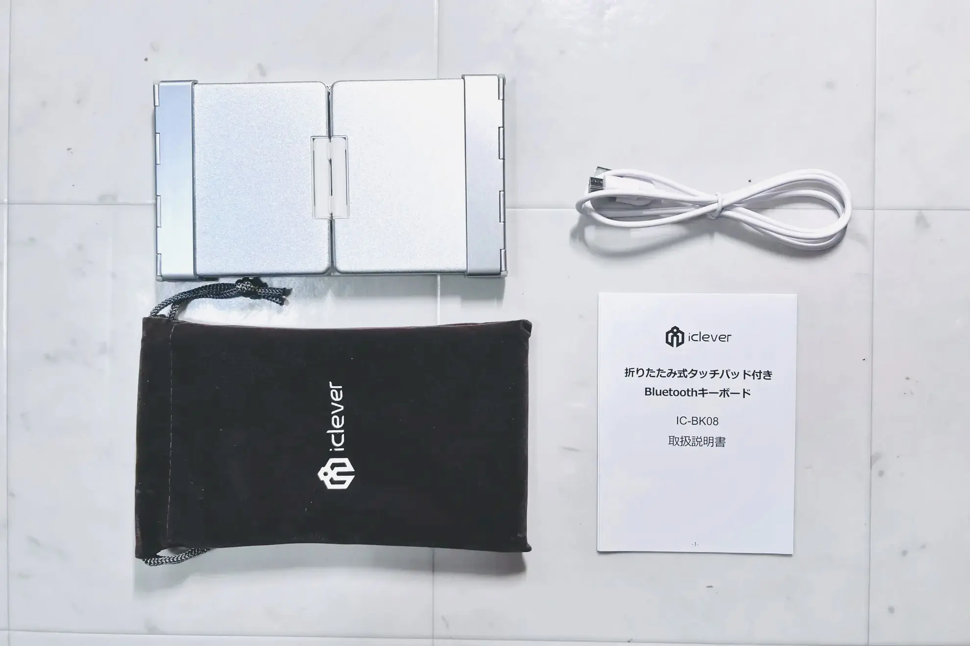 内容物は左上からキーボード本体、USB-A to micro USB充電用ケーブル、収納用の袋、取扱説明書だ。驚いたのはスウェード調のしっかりした収納用の袋が付属していたこと。しかし、microUSBは今となっては時代遅れなので、USB-Cに対応して欲しかった所。