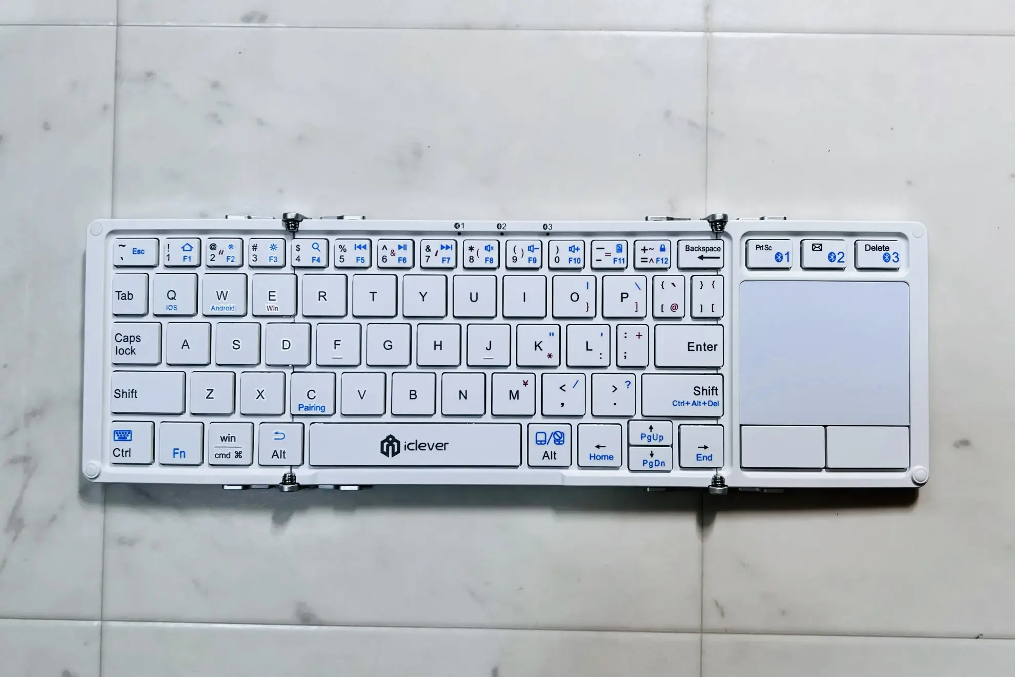 右端に小さめのトラックパッドがある。トラックパッドの上のボタンに青字で「1」「2」「3」と書かれているように3台までペアリングすることができる。ペアリング方法は「Fn」キーを押しながらトラックパッドの上部にある、登録したい番号のボタンを押した後、もう一度「Fn」キーを押しながら、「C(Pairing)」を押すと、ペアリングモードになり、Bluetooth機器で接続することができる。キー入力の感じは、ほぼ遅延はなく、とても快適に使えた。ちなみに、このiCleverのキーボードはUSキーボードなので、英字入力と、ローマ字入力を切り替えるには「Ctrl」キーと「Space」キーを同時に押すことで切り替えができる。このキーボードで感心したことは、キーボードを三つ折りに閉じると電源オフがになり、開けるとすぐに電源オンになり、前回ペアリングした機器と自動で再接続してくれて、開けたらすぐ使える状態になっていることだ。