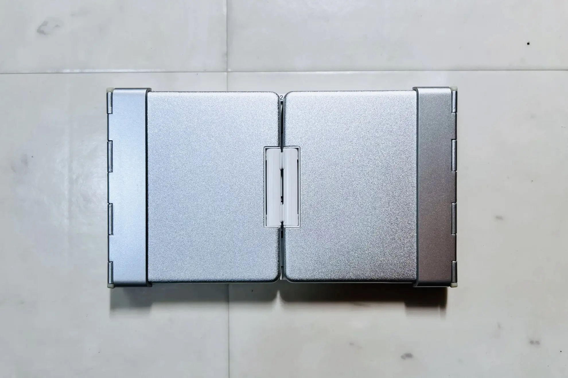 本体は折り畳んである状態だとこんな感じ、折り畳んだ状態だとサイズは6.7インチの大型のiPhoneとほぼ同じ大きさでガジェットポーチにも入る。筆者は白系の色が好きなのでシルバーを選んだ。材質はシルバーのMacbook Airをもっとザラザラにした質感。