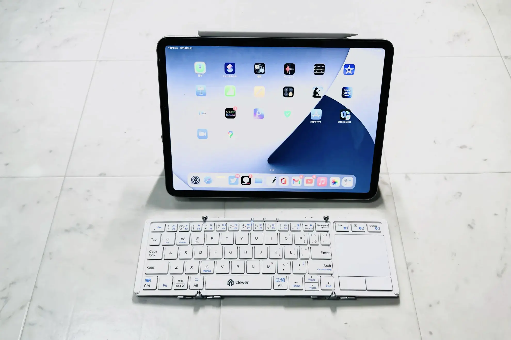 iPadの大きい画面ではやはり、別途の物理キーボードがあると便利に使えると感じた。そして、三つ折りになってコンパクトにできるので、外出先で使えるのが大きい。しかも、開くとすぐに電源オンになって自動で再接続してくれるので、すぐ使えてこれには驚いた。キーの入力も遅延なく、快適に使えた。iPadは横向きにして、タッチパネルで文字入力をすると、画面に表示されるキーボードの画面占有率がすごいことになるので、Bluetoothで繋げられる、コンパクトな物理キーボードはとてもありがたい。それと、iPadでOfficeファイルをいじるときは、ポインターがあることでタッチするより快適に使えるのでそこも便利だと感じた。