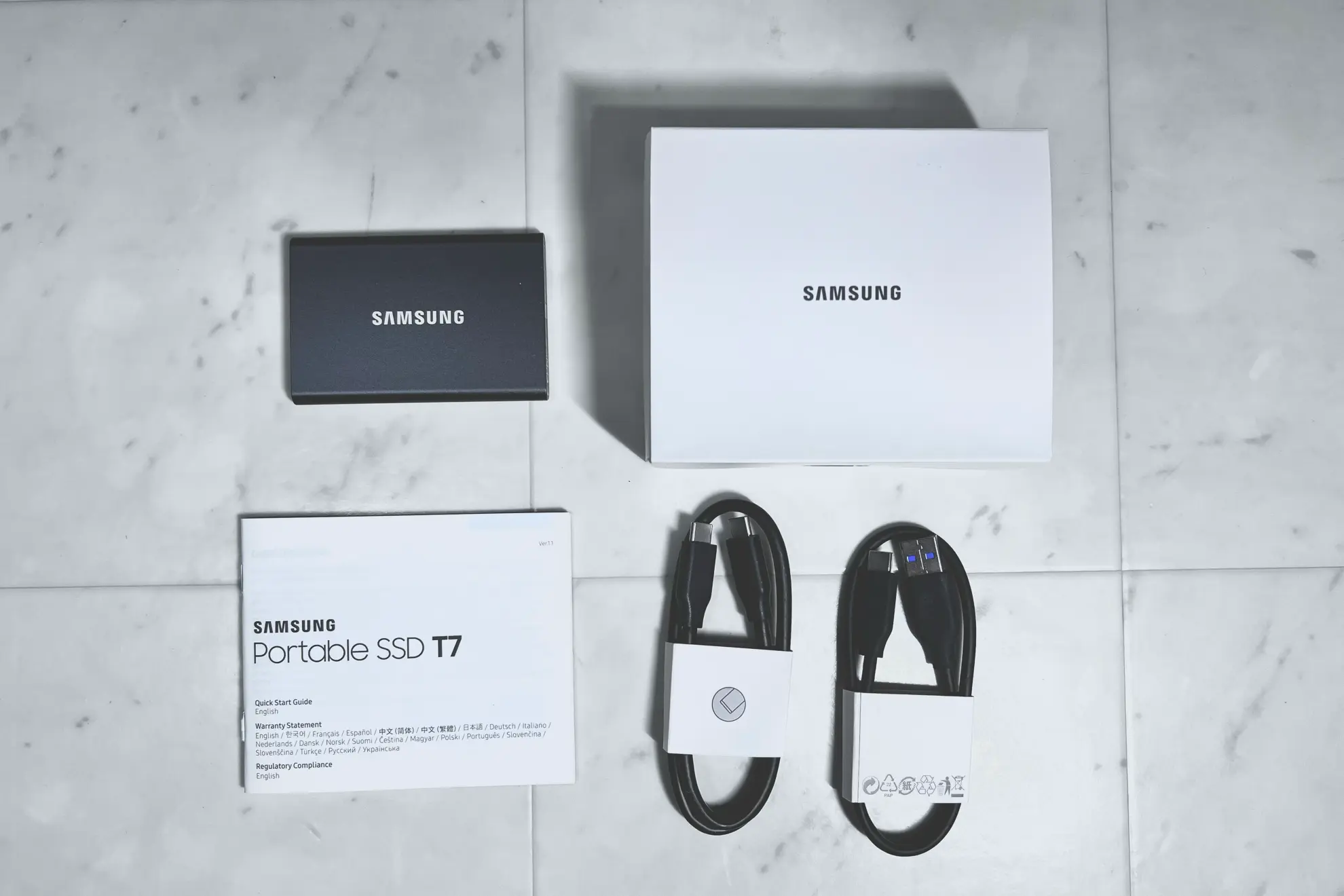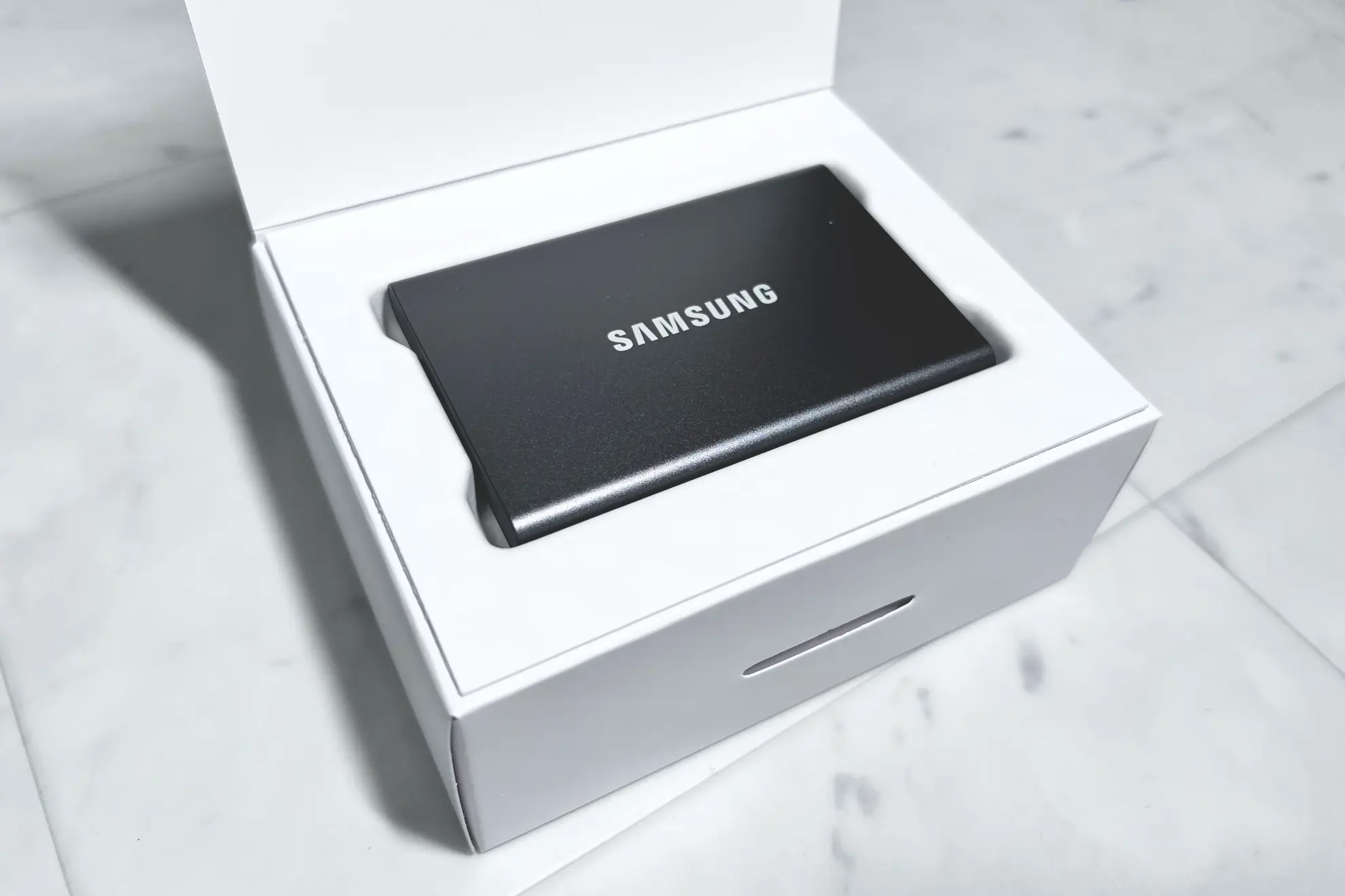 箱を開けるとすぐに、少し高級感のある感じで本体が入っていた。もう少し安い同じような製品もあったがこのサムスンのT7が一番スタイリッシュだったのでこっちを選んだ。