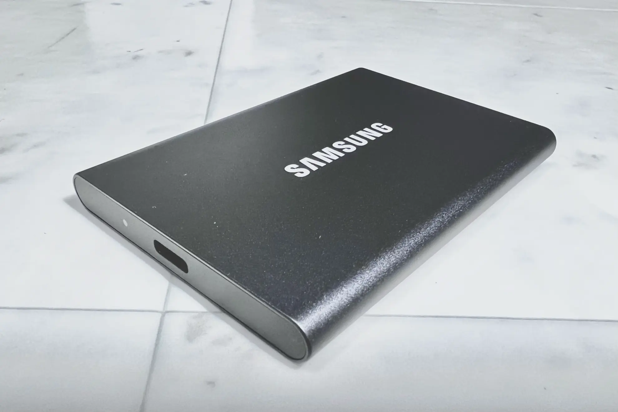 今回紹介する製品はSAMSUNGのポータブルSSD、SAMSUG Portable SSD T7の1TB。これは、持ち運び用のデータを保存するためのポータブルSSD(ストレージ)だ。今までは、2TBのポータブルHDDを使ってきたが、HDDは製品の機構上、動かすなどの持ち運びには適さない上、読み込みが早いとは言えないので、扱いやすいポータブルSSDを購入した。SSDの2TBモデルもあるが、それはあまり安くないので1TBモデルを購入した。ちなみに、このSSDの最大読み込み速度は1050MB/sだ。