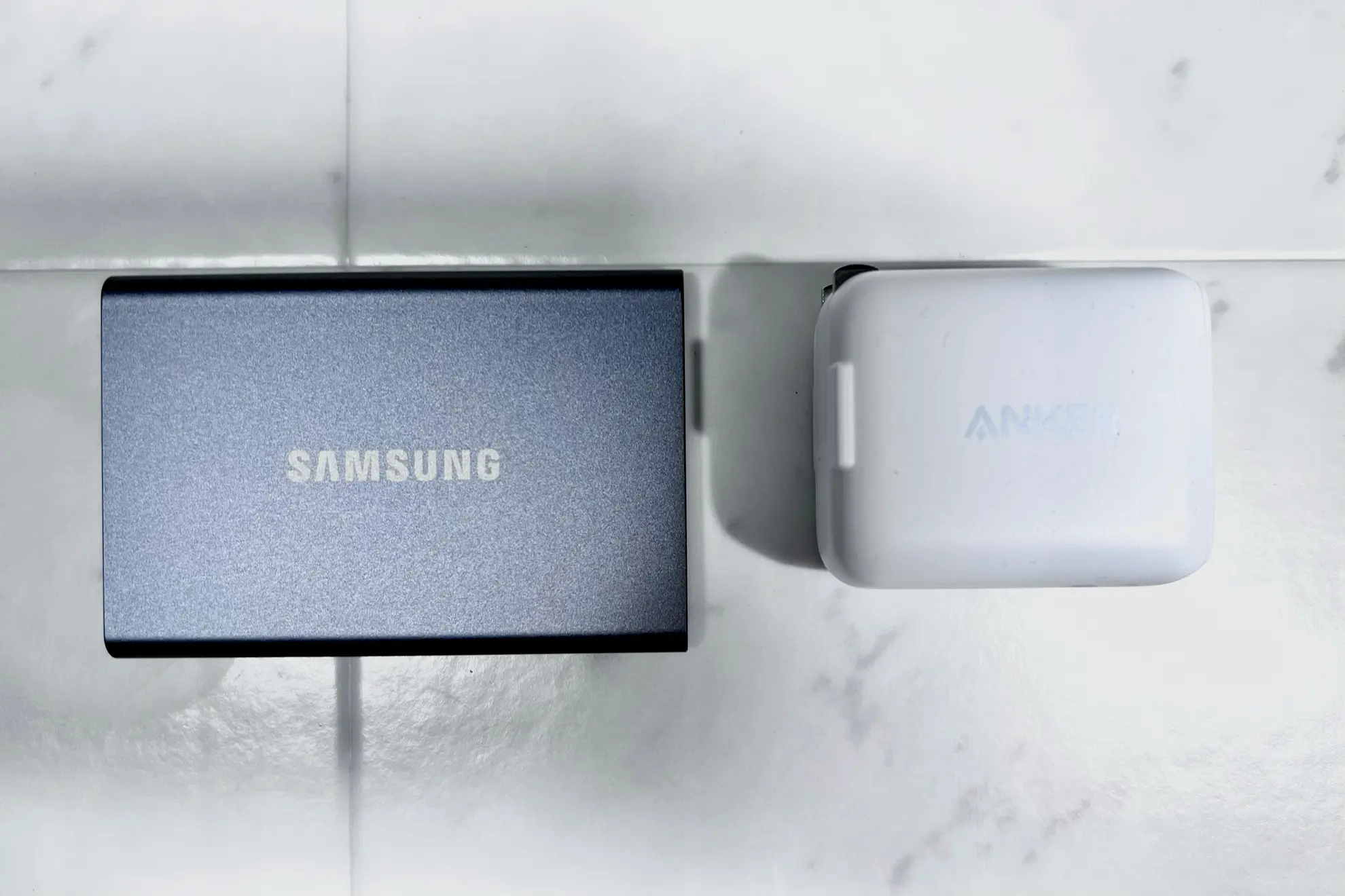 このT7のSSDを見て一番びっくりしたのが、この小さいサイズである。コンパクトなAnkerの30Wの充電器と比べてもこのサイズ感。さらに、薄い上に持った感覚がないぐらいに軽いので驚いた。10年前ではテラバイト単位のストレージでこのコンパクトさは想像できなかった。
