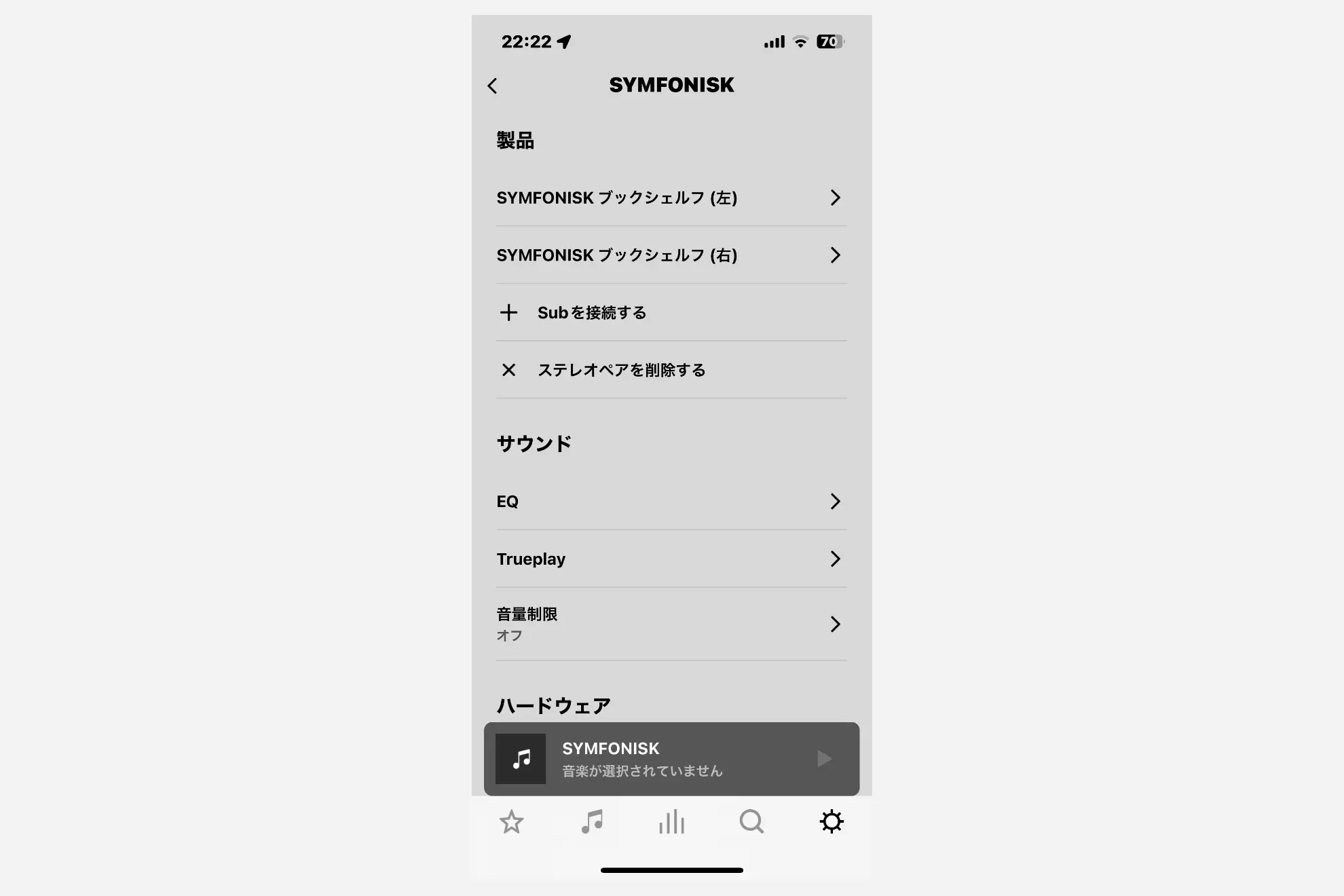 SONOSアプリでのSYMFONISKの設定画面はこんな感じ。筆者は同じSYMFONISKスピーカーを2つ購入していて、ステレオペアとして利用している。ステレオペアの設定もSONOSアプリから可能。低音、高音の調節も可能。