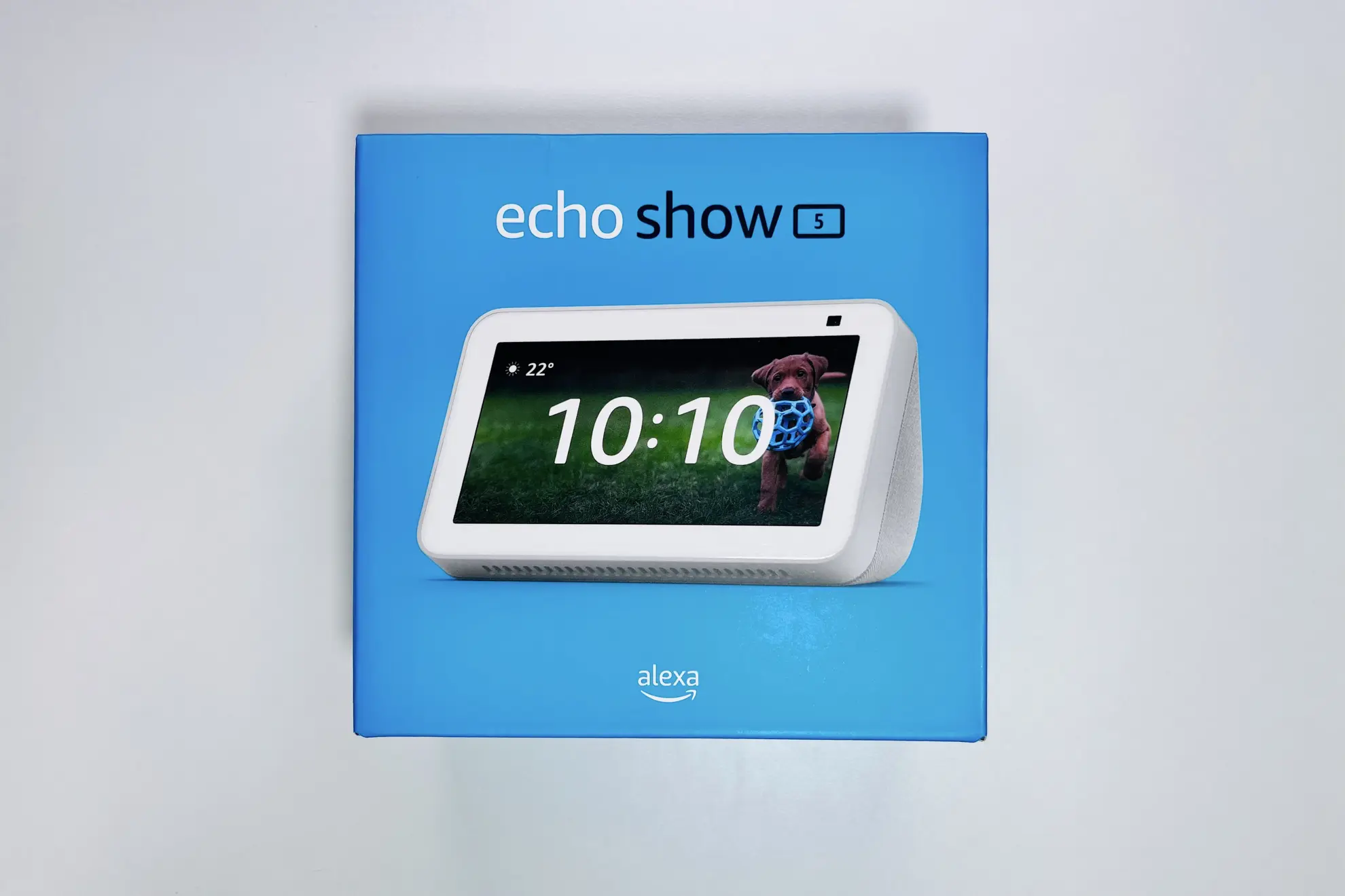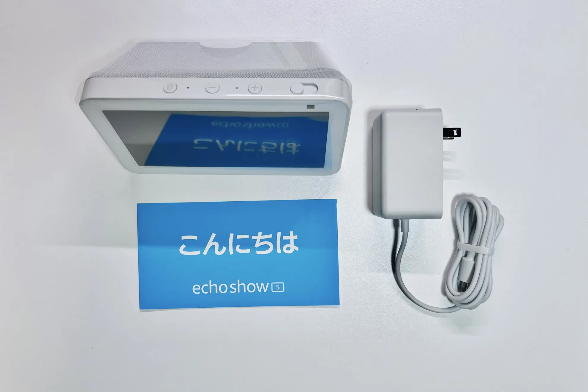 内容物はEcho Show 5本体とACアダプターと紙類。ACアダプターが本体と同色なのは好印象だが、アダプター部が大きいのと端子がUSB系統ではないのが惜しい。本体上部には音量調節ボタンとカメラオンオフのスライド機構や、マイクのオンオフ切り替えボタンがある。