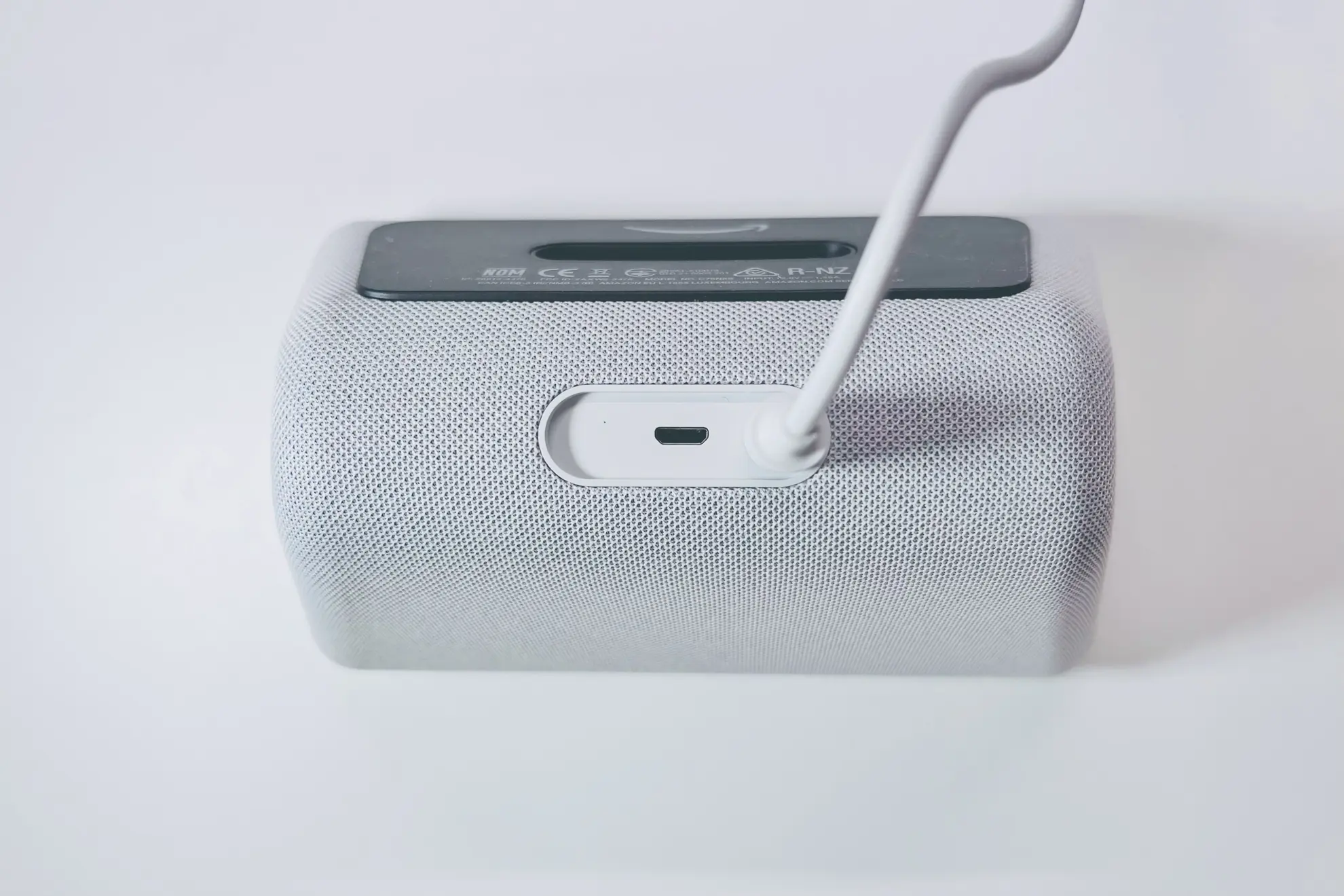 本体の後方部はスピーカーで、布張りになっていてクオリティは高い。