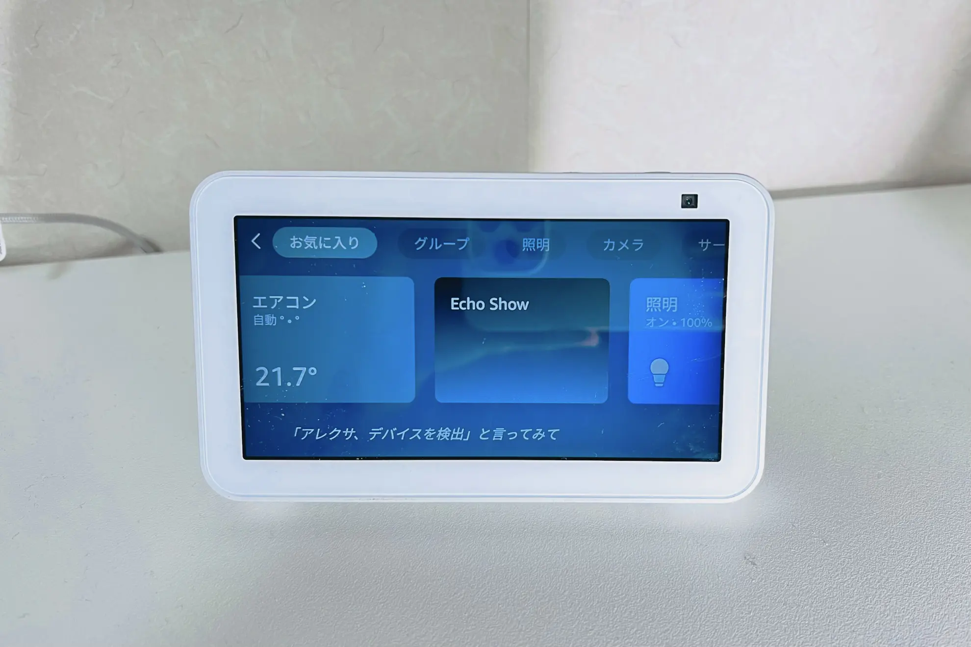 このように声だけでなくとも、画面操作で家電を操作することができるから便利。このEcho Show5はなにも画面操作をしてない際は時計が表示されるのだが、これは机に置時計があるような感じでこれも結構助かる。そして、本体の右上にはカメラも搭載されていて、外出先でもAlexaアプリから部屋の状況を確認することが可能。スマートリモコンやスマート家電を導入している人は非常に生活が便利になるアイテムだと感じた。ただ、それらを持っていない人はただの置時計になってしまいそう。
