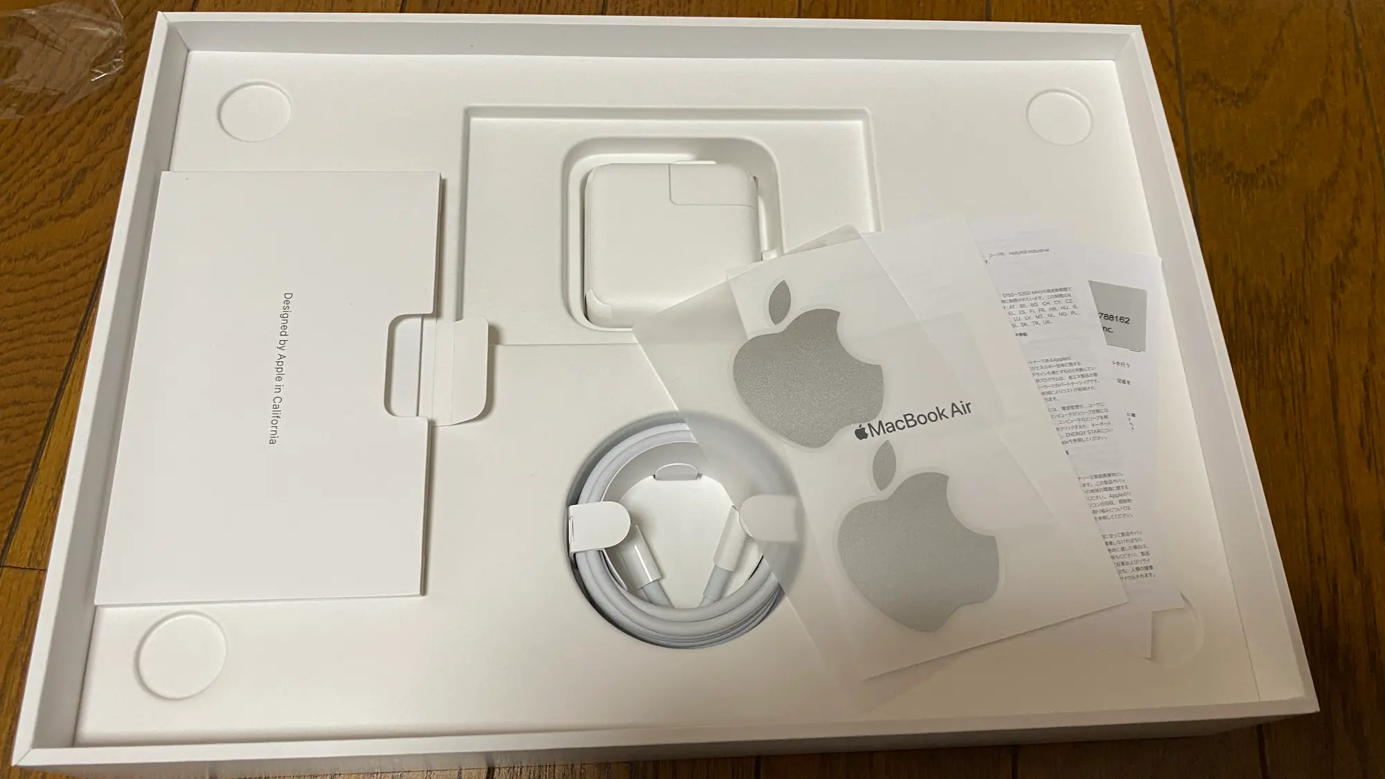 本体を取り出すと付属品はAppleシール、マニュアルなどの書類、2mのUSB-Cケーブルと30W電源アダプタが入っていた。しかし、私はこの電源アダプタは使わない。それと、USBケーブルも同じ物を持っているので使う予定はない。それから、電源アダプタは単体で買うと税抜4,800円もするので付属品を無くせば、もっと安くできるのではないかと思う。