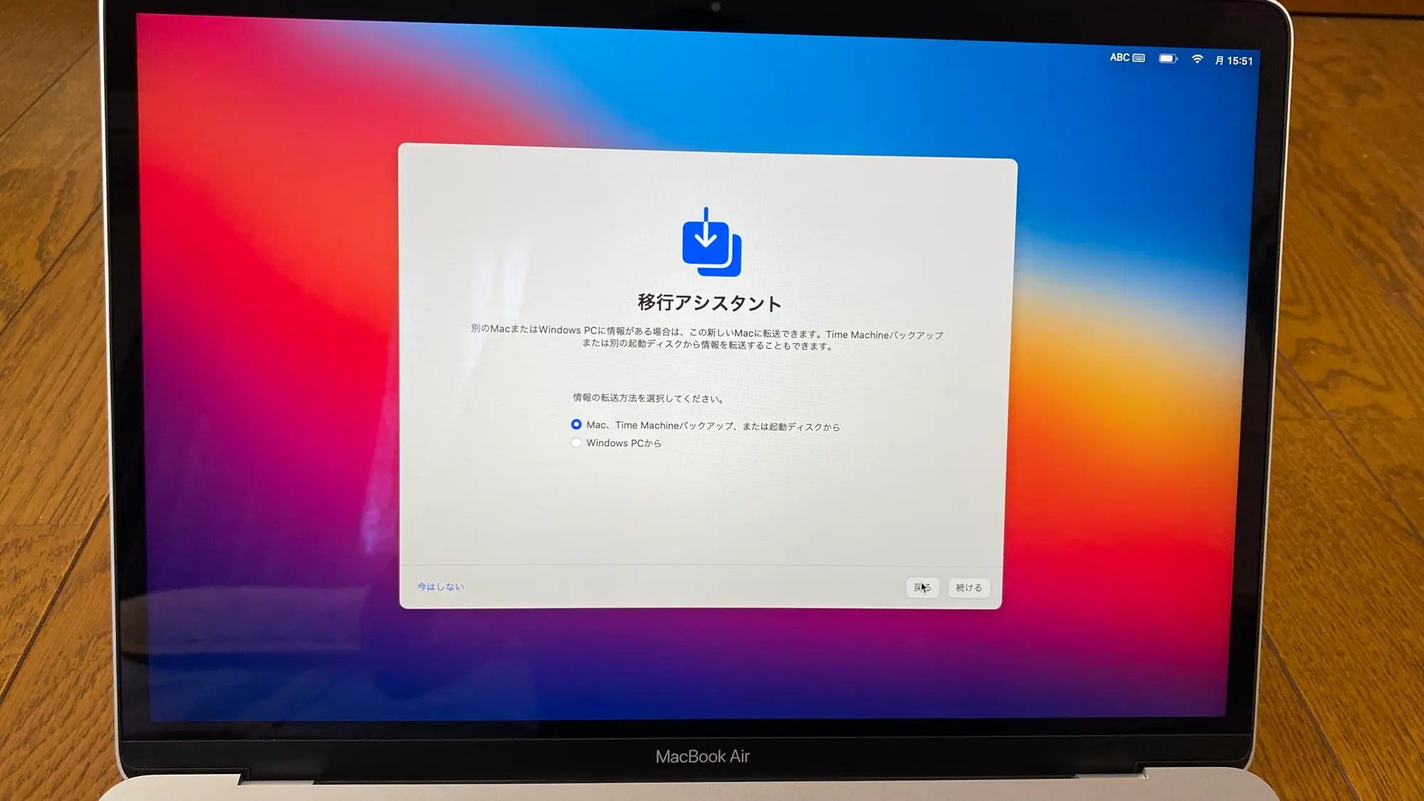 そして画面の指示通りにセットアップを始めていく。いままで使っていたMacbook ProをTimeMachineでUSBにバックアップをとっているので、そこからデータ移行をする。とても簡単でほぼ初期設定の必要がない。これはMac同士の利点の一つ。TimeMachineで移行すると設定もそのまま移行してくれるので、すぐにいままでの環境と同じように使い始めることができた。